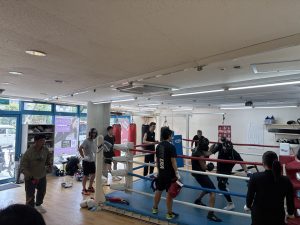このリングの中でミット打ち、マスボクシングやスパーリングをします。